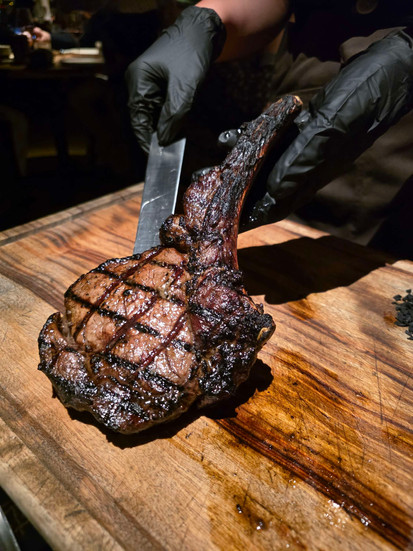Now, our steak. We were presented with a small but curated menu of steaks from Collinson and Co, O'Connor as well as Mayura Station. All of the 3 largest beef purveyors in Australia. Our service staff also shared about the in-house dry aged beef. At 270 AUD/kg, the dry-aged steaks represent one of 6HEADs more premium offerings. We opted for a 700g dry-aged steak on the bone and were presented our steak before it was sent off to the kitchen. We were told that the beef was prepared with chocolate flavoured rubs, which adds really unique dimensions to the aging process.