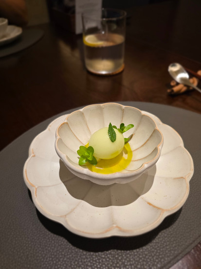 My stand out dish was the Soon Hock or Marble Goby. The skin is astonishingly crispy while the flesh beneath remains juicy. The broth evokes the luxurious texture and taste memory of Shark Fin Soup, without any of its ethical baggage, finishing with a clarity that invites reflection more than indulgence. Our sommelier also did an amazing job recommending a rare vin jaune (Yellow Wine). The wine, aged under air for 4 years to allow light oxidation, mirrors the dish and finished with a note of aged vinegar, a precise, clean echo to the intention of this dish, a memory evoking shark fin soup dish with a splash of black vinegar. For me, this dish and pairing was absolutely perfect.